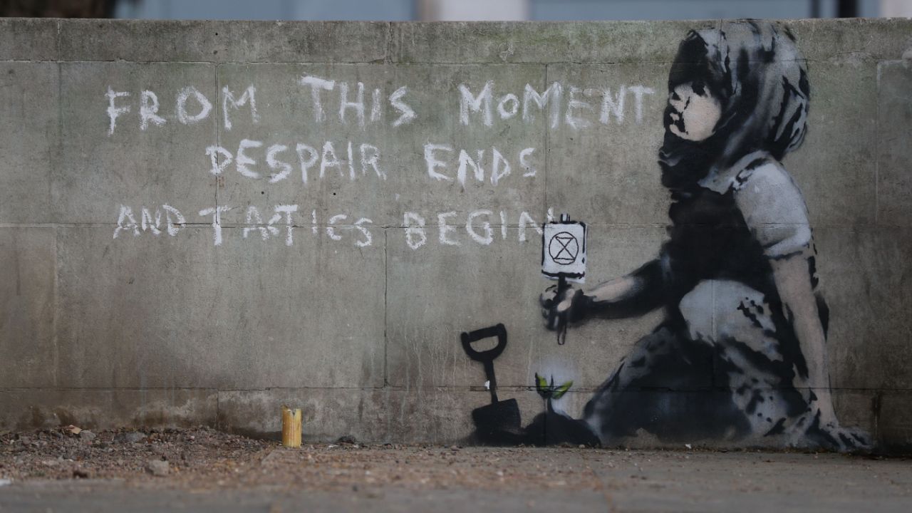 A mural depicting a girl, a plant and an hourglass, the symbol of the Extiction Rebellion movement, appeared at the Marble Arch, the BBC reports.
