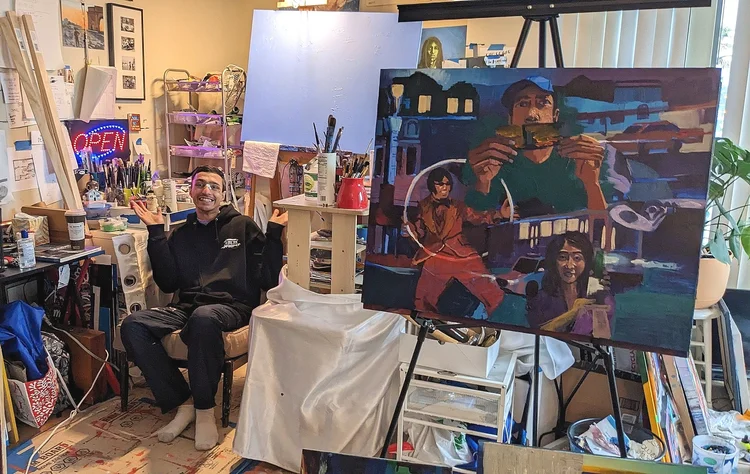 The cityscape can be very awe-inspiring and yet deeply isolating at the same time. The scale of the city’s large structures and monuments can overshadow the humans that live colorful lives within it. Jun Yang, Bad Bunny, and Andrea Zamora are just a few humans that are featured in my paintings in this group show. A painter, a musician, and an actress to capture the range of artists. It was important to include figures in this work as it’s an homage, a dedication, and a display of my love and gratitude to be inspired by them. There’s a painting in the show that is my favorite, “It Takes An Entire City To Build Artistic Bridges.” It is a self-portrait, capturing myself as kid with my grandfather, myself as an 8 year old, and me as a 25 year old. I miss my grandfather. He passed away when I was 15. It was his dream to move abroad, but he chose to support his parents, wife and kids. Almost a century later, I’m able to move to San Francisco and build my life here. These 3 portraits are set on the background of the Golden Gate Bridge being built from 1933—a recognition that this magnificent bridge was once baby-like, built by thousands of humans and with the support of the city, state, and federal governments. Likewise, I’m the baby, being built to connect people. As a curator I feel my role is to connect communities of artists with art lovers. Lastly there is a small icon of Hamilton The Musical with a full-finished Orpheum Theater in the painting. I love the American experiment in democracy and I value its existence. It’s not perfect at all, but there is within it a hope for a more perfect union.