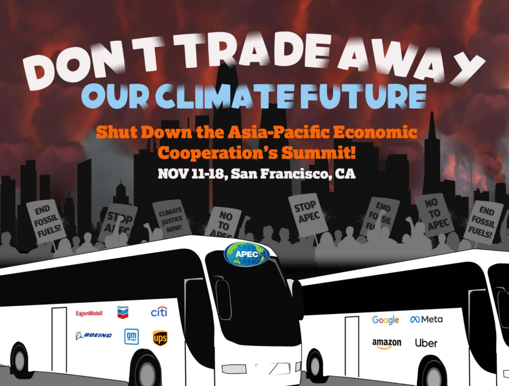 ![]() APEC Resistance Workshop: Climate Action and APEC Resistance Workshop: Wed, Nov, 8th , 7:30 – 8/;30 at UC Berkeley’s Tilden Room (MLK BUIlding)Learn about the fight between neoliberal trade policy and bold climate action. Find out about upcoming opportunities to organize against APEC.RSVP Today ![]() Rally Outside APEC! Thurs., Nov 9th @ 10:30am at Yerba Buena Gardens Ahead of their meeting, demand that APEC leaders and IPEF negotiators listen to the people instead of corporations. Hope to See you There |