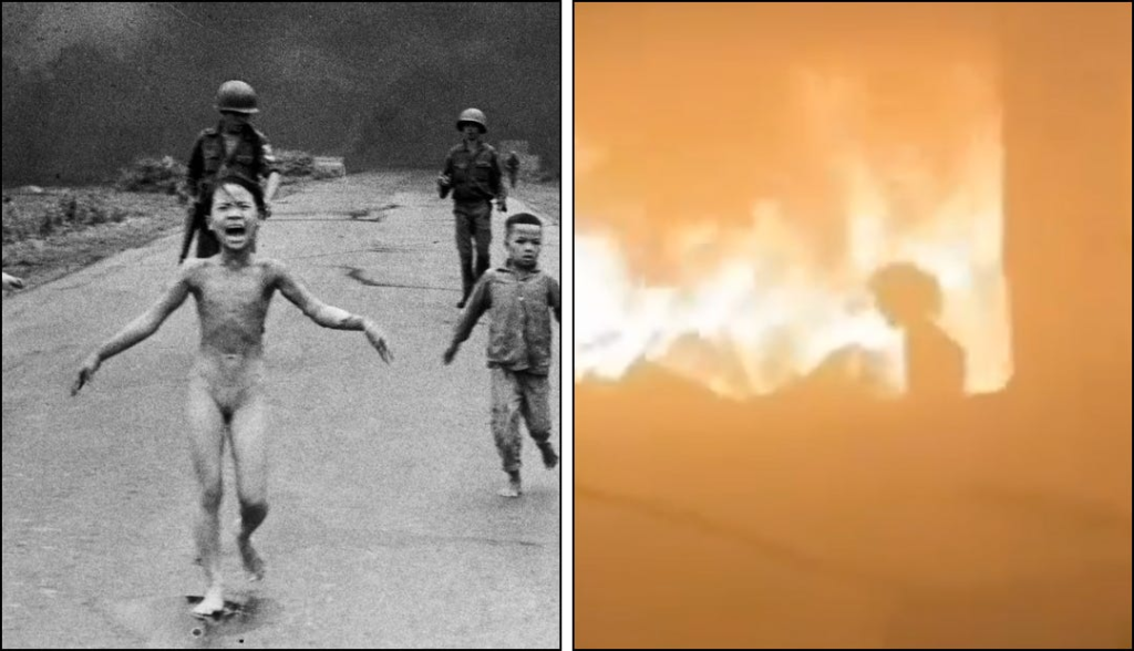Left: Phan Thi Kim Phuc runs screaming after the South Vietnamese army dropped napalm in 1972. Photo by Nick Ut/AP/Public domain; Right: Ward Jalal al-Sheikh Khalil attempts to escape the flames after Israel bombed a school sheltering displaced Palestinians in Gaza. Photo: Screenshot via Twitter