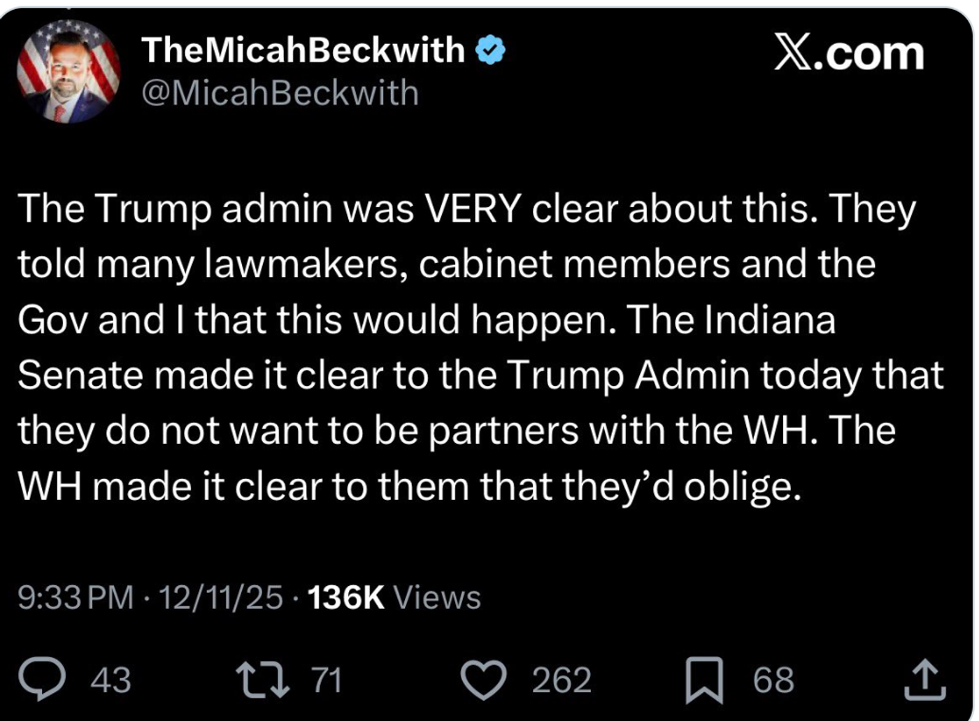 “The Trump admin was VERY clear about this,” he wrote, referring to threats to take away federal funding for Indiana. “They told many lawmakers, cabinet members, and the [governor] and I that this would happen. The Indiana Senate made it clear to the Trump admin today that they do not want to be partners with the [White House]. The WH made it clear to them that they’d oblige.”