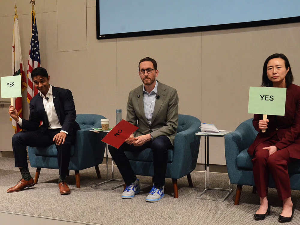 Supervisor Connie Chan and former congressional staffer Saikat Chakrabarti held up signs that said, “yes.” Wiener didn’t hold up a “yes” or “no,” telling reporters afterward that his position was more detailed than the format allowed for.