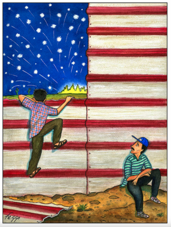 In 1999, Felipe Galindo (Pen name Feggo) drew “4th of July From the South Border,” an endlessly reproduced and reprinted piece criticizing the militarization of the border with Mexico. Starting in 2022, Feggo’s work hung in the Smithsonian’s National Museum of American History as part of the ¡Presente! A Latino History of the United States exhibit.