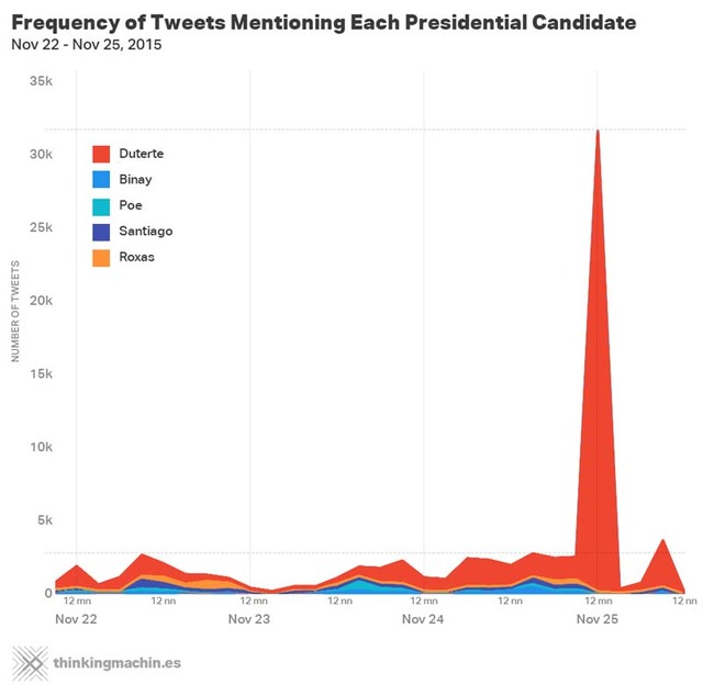 Four days after he declared his presidency, from midnight to 2am on November 25, 2015, more than 30,000 tweets mentioning Rodrigo Duterte were posted, at times reaching more than 700 tweets per minute. That’s more than the number of tweets posted when he declared he would run, and more than all the tweets about any presidential candidate over the previous 29 days.