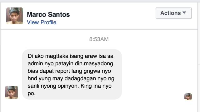 DEATH THREAT. A Facebook user tells Rappler that he won’t wonder if one of our administrators or managers will be murdered.