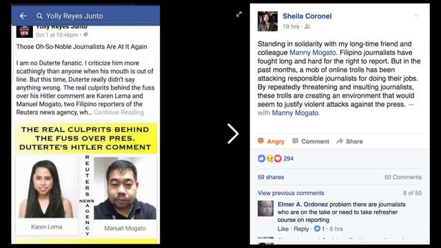 Over the weekend, Reuters reporters Manny Mogato and Karen Lema were targeted after reporting President Duterte’s remarks about Hitler.