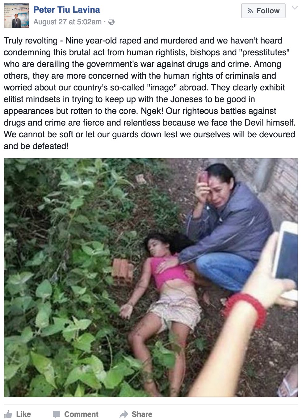 Take another example: a post by Peter Tiu Lavina, Duterte’s campaign spokesman, who attacked critics of the government’s “war on drugs” with his statement about a 9-year-old girl who was raped and murdered.