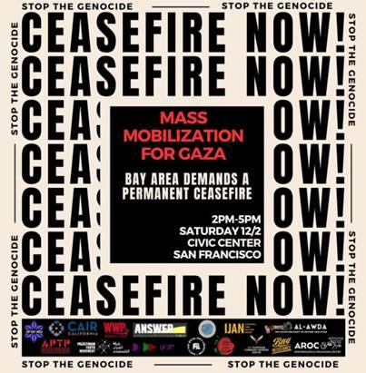 Join us Tuesday, December 5th at 2PM at San Francisco City Hall and call on the Board of Supervisors to support a permanent ceasefire!