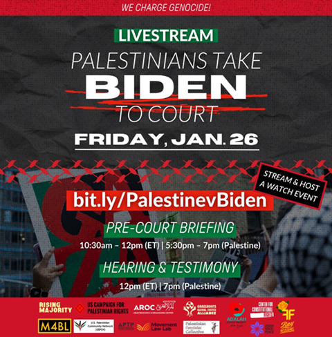 We Charge Genocide: Int’l Day of Action” join Palestinian organizers & allies ahead of the historic lawsuit against Biden for complicity in genocide in Gaza. Then join LIVE in the court for testimony from our Palestinian plaintiffs.