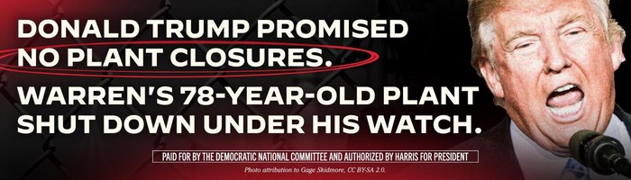 “Donald Trump broke his promises to Michigan’s working families,” said Stephanie Justice, a DNC spokesperson. “On his watch, a Warren car plant closed and the auto industry bled thousands of jobs.”