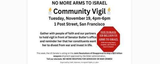 Info for vigil on Facebook: NO MORE ARMS TO ISRAEL: COMMUNITY VIGIL | Facebook