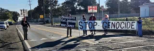 Later, at about 2pm, a group of 8 activists, along with  Franklin Sterling, KPFA’s independent journalist, regrouped at the North Gate to bring our “human blockade” insignia to the base:  “If our government won’t stop arming Israel, then we, the people, will stop it ourselves.”  Quickly parking our cars, five human blockaders stretched across the two lane Gate Rd to create the “people’s embargo.” Their large banner said, “STOP GENOCIDE”;  their signs included:  “PROSECUTE COL. JOHNSON 4 WAR CRIMES” (Travis’ commander) and “NOT ANOTHER BOMB.” A legal observer was present and  other support folks.
