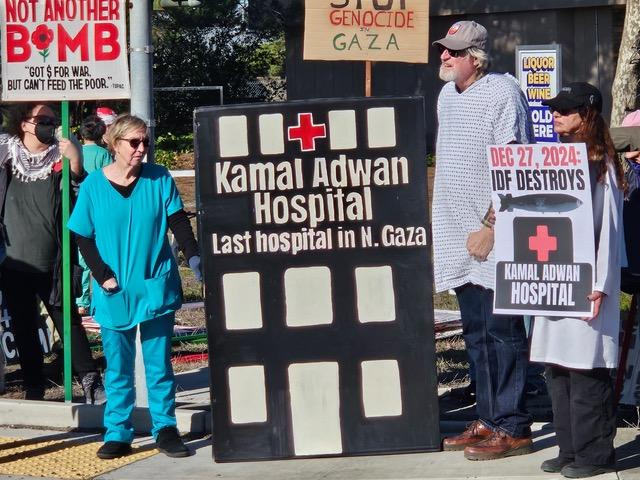 Demonstrators Thursday were dramatizing the “hospitalicide” of Gaza made possible by U.S. bombs. In particular, Kamal Adwan Hospital, the last functioning hospital in the North, was destroyed by Israel in late December 2024. The director, Dr. Hussam Abu Safiya, is still missing and believed to be detained at Israel’s notorious Ofer Military Prison in the West Bank, known for torture and other abuses.