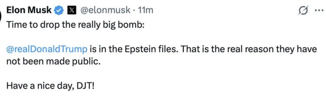Last month when Trump and Musk first began to break up, Musk dropped what he dubbed a “bomb” about these very files, writing on Twitter, “Time to drop the really big bomb:@realDonaldTrump is in the Epstein files. That is the real reason they have not been made public. Have a nice day, DJT!”
